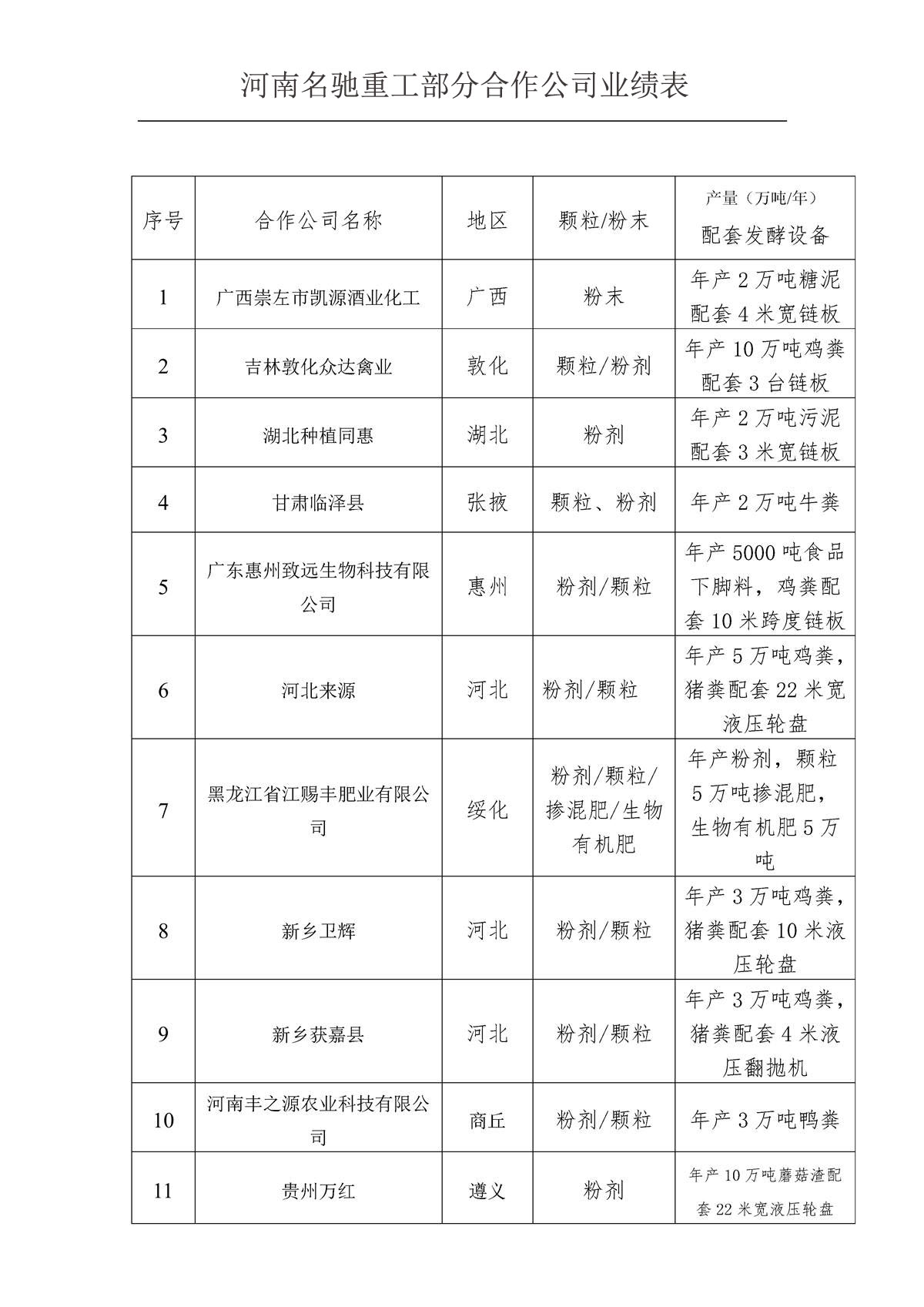 名馳重工近期部分合作公司業績表, 廣西崇左市凱源酒業化工有限公司,吉林敦化眾達禽業,湖北種植同惠,廣東惠州致遠生物科技有限公司,黑龍江省江賜豐肥業有限公司等,以上客戶現場可以隨時參觀考察!